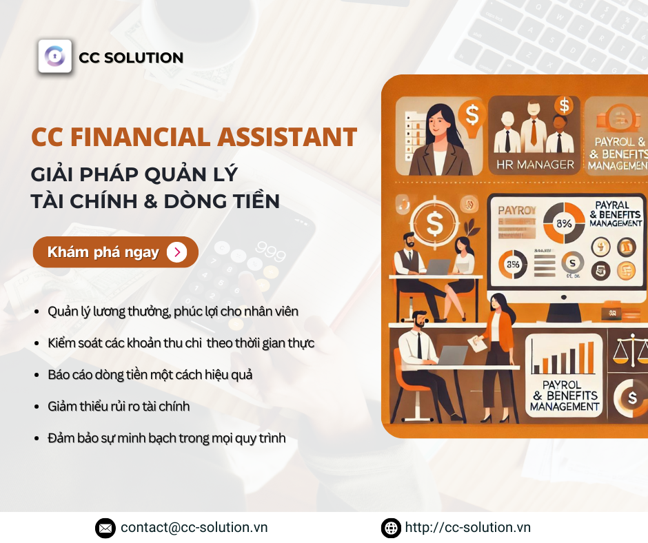 Hãy liên hệ với chúng tôi ngay hôm nay để trải nghiệm miễn phí CC Financial Assistant và khám phá cách nền tảng này có thể hỗ trợ doanh nghiệp bạn quản lý lương thưởng và phúc lợi một cách hiệu quả, giảm thiểu sai sót và rủi ro, đồng thời nâng cao hiệu suất và sự hài lòng của nhân viên.